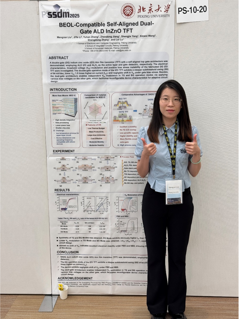 博士生刘梦然则通过“BEOL-Compatible Self-Aligned Dual-Gate ALD InZnO TFT”的简短口头汇报,介绍了其在后道工艺兼容双栅晶体管技术方面的探索。这些报告从材料、器件结构到集成工艺等方面,展现了实验室在薄膜晶体管领域的研究广度,引发了与会者的关注。