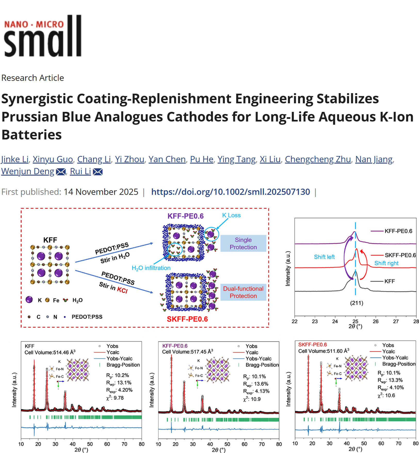 | ● Congratulations to Jinke Li (李金科)! His paper entitled "Synergistic Coating-Replenishment Engineering Stabilizes Prussian Blue Analogues Cathodes for Long-Life Aqueous K-lon Batteries" was accepted for publishing in Small. (2025-11-14)