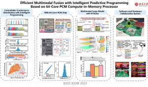随着人工智能向通用人工智能(AGI)演进,融合图像、文本等多种数据源的多模态模型成为研究热点。然而,在资源受限的边缘设备上部署这些模型面临着巨大的算法与硬件挑战。杨玉超教授课题组联合中科院上海微系统所宋志棠研究员团队,研制了一款基于40nm工艺的9Mb 64核相变存储器(PCM)存算一体SoC级处理器。针对传统电阻漂移模型难以精准预测随机电导分布和多模态融合计算复杂等问题,杨玉超教授课题组通过软硬件协同设计,实现了以下关键技术创新:1、基于机器学习的智能预测编程方法,针对PCM非晶态的结构弛豫特性,课题组提出了一种利用机器学习模型反向预测写入范围的智能编程方案。该方法根据漂移后的随机电导分布反向精准预测漂移前的电导写入范围,相比传统经验漂移模型,写入精度提升了26.3%。这一创新实现了对器件电导分布的灵活、高精度控制;2、利用PCM随机特性实现正激励(Positive-Incentive)分布,课题组创造性地利用PCM器件固有的随机电导特性来模拟“正激励噪声”(PI-noise)。通过将模拟电导用于编码层、随机电导用于正激励层,该芯片在硬件层高效实现了正激励分布,有效降低了任务熵,增强了图像与文本的语义融合能力,显著提升了模型在边缘端的泛化性能。