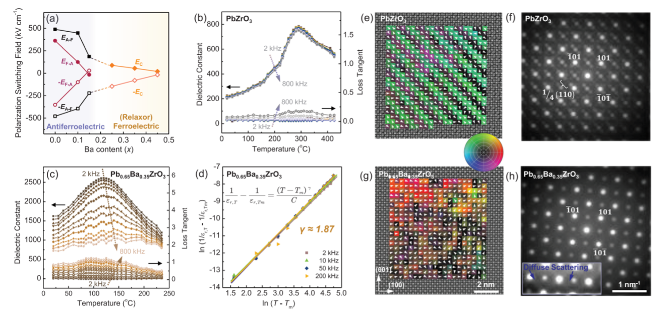 图2. (Pb,Ba)ZrO3薄膜的反铁电-弛豫铁电相变过程中介电响应和极化结构的演化
