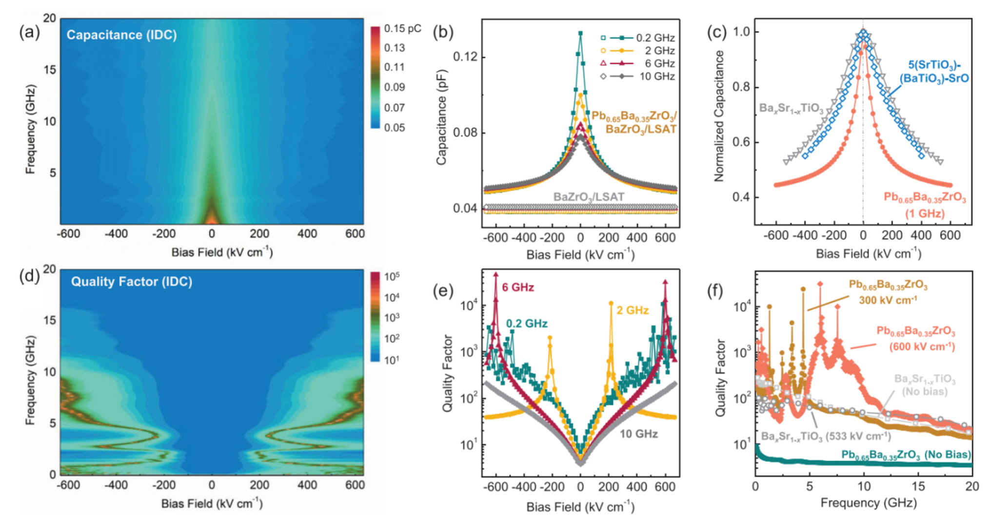 另外,针对反铁电材料介电响应低、滞回损耗大的问题,潘豪团队近期利用脉冲激光沉积技术,在PbZrO3薄膜的亚晶格尺度上引入Ba元素,成功诱导出现介电弛豫行为并形成极性纳米微区结构。研究阐明了(Pb,Ba)ZrO3薄膜中“反铁电-铁电-顺电”多相竞争的复杂相变过程(图2),实现了介电响应和介电可调性的显著提升:在10 kHz, 200 kV/cm偏压条件下,介电调谐率(dielectric tunability)达到81%;在500 kV/cm下进一步提升至91%,性能超越绝大多数传统弛豫铁电薄膜。该材料的介电可调性在微波(GHz)频段仍能保持,并表现出较高的品质因数(图3),在微波通信、移相/谐振器件领域具有重要应用潜力。该工作揭示了反铁电体到弛豫铁电体的复杂相变过程,为反铁电薄膜材料的性能调控和功能开发提供了新的技术路径。