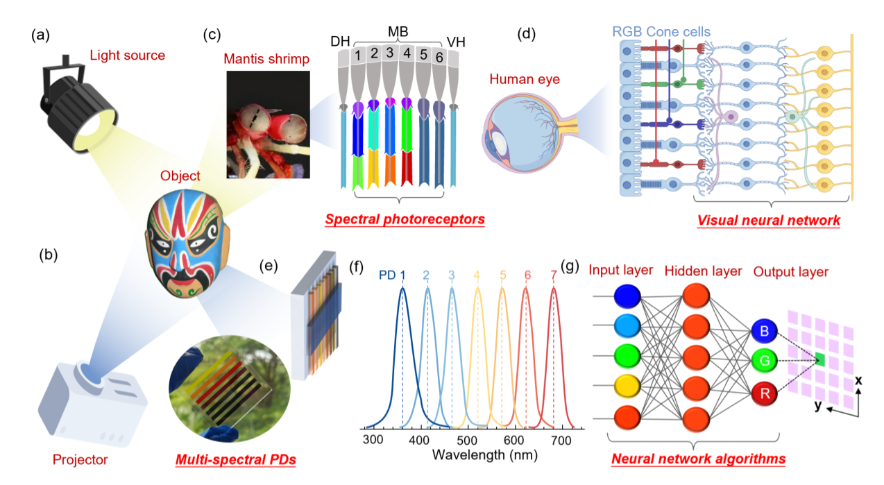 近日,北京大学深圳研究生院与西安电子科技大学的研究人员创新性地提出一种基于仿生视觉的多光谱融合策略。该策略依托团队自主研发的气液固喷涂技术(ALS),成功构建出覆盖紫外-可见光谱的七通道窄带钙钛矿光电探测器阵列,并结合深度学习颜色融合算法(MSCF-DNN),实现了通过单次拍摄捕获全光谱信息并准确还原RGB色彩的能力,为遥感监测与医学成像等领域提供了新的技术路径。相关研究成果以“Biovision-Inspired Perovskite Intelligent Camera for Panchromatic and Metameric Sensing”为题发表在国际学术期刊《Advanced Materials》。