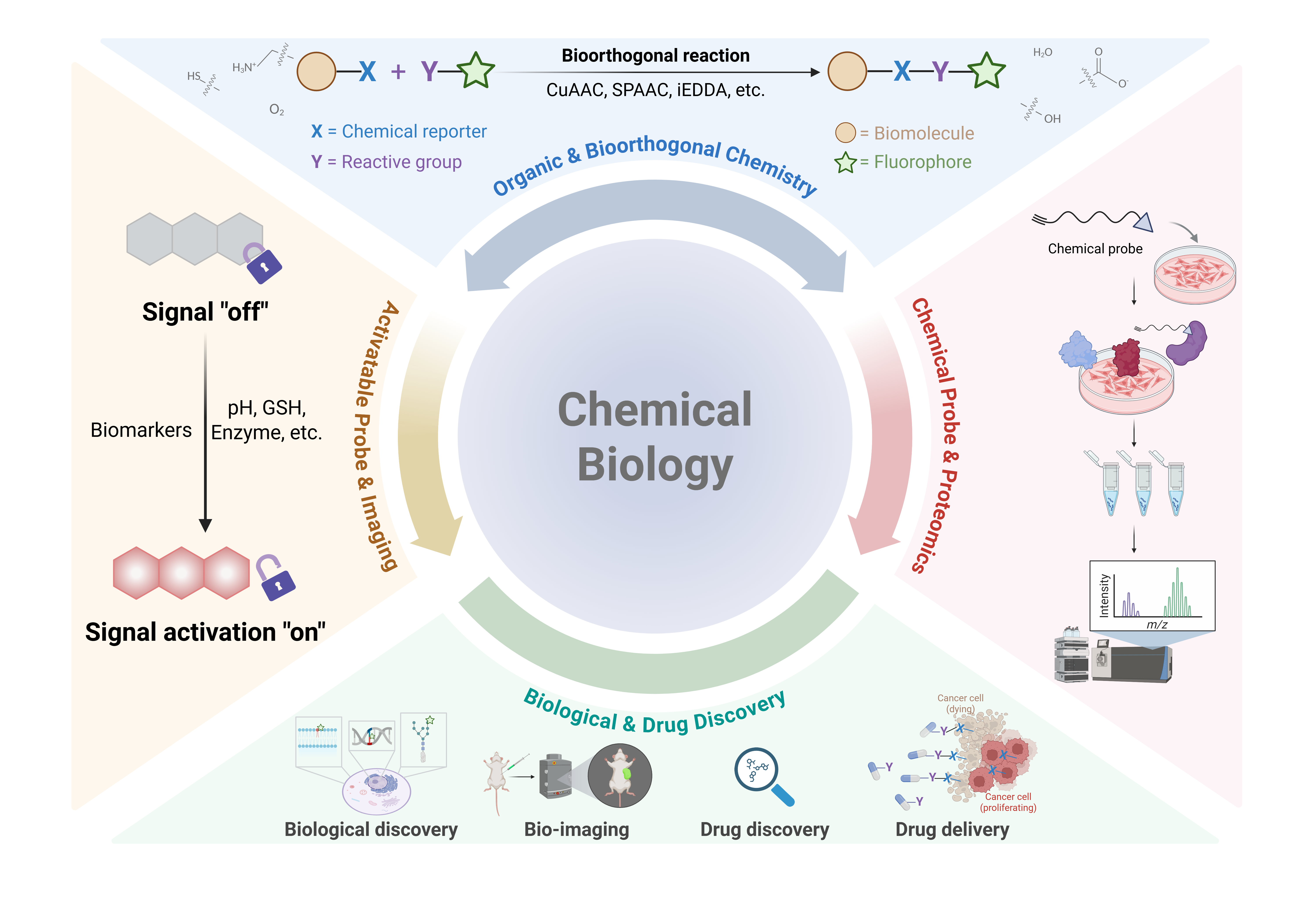 (1)有机与生物正交化学:针对生物分子的特异性检测和动态标记,发展高效、选择性的化学反应策略,为开发可激活探针和化学探针奠定基础,为生命过程研究提供精准化学工具。
