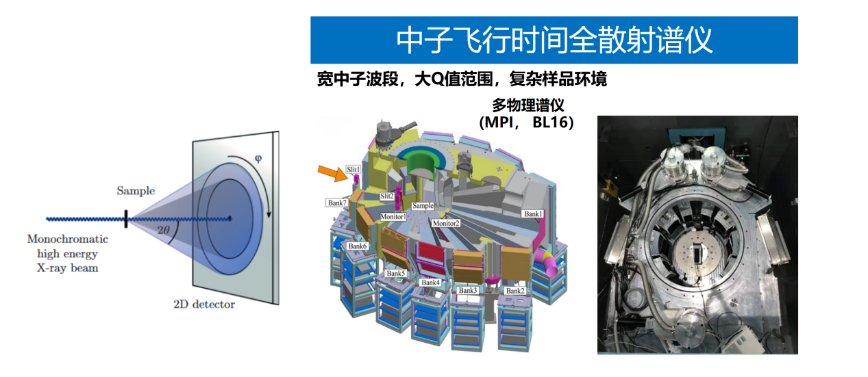 图 10 同步辐射面探测器示意图(左)与飞行时间中子全散射谱仪(右)
