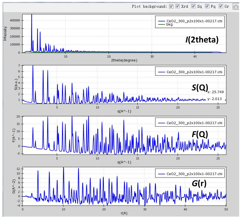 在完成高质量全散射数据测量后,需要对数据进行转化并得到校正规约后的PDF函数,之后的数据分析过程将基于PDF函数来完成。通过对背景强度和Q值范围等参数的调整,从背景全散射数据和样品的全散射数据中转换得到对应的PDF函数。