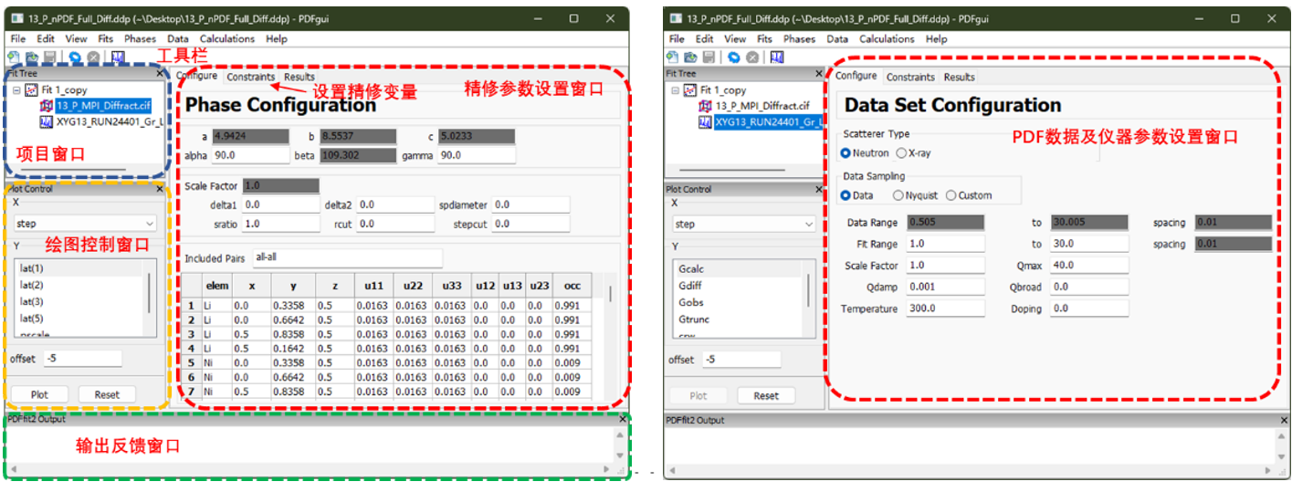 5.1 PDFgui应用:PDFgui是一种使用广泛的PDF函数分析工具,它是完全开源免费的。该软件基于“小盒子”模型对于X射线/中子PDF图谱进行拟合,其工作流程是通过导入PDF数据以及初始晶胞结构来为我们待拟合数据的结构设置一个模型。拟合过程即通过调整最小二乘法精修模型中的可变参数,直到实验和计算的PDF图谱之间获得良好的一致性。PDFgui的应用窗口如图12所示,它支持基于CIF(晶体学信息文件)的晶体结构模型导入或手动添加原子,同时能够实现从初始晶体结构模型出发的模拟PDF图谱计算以及图谱拟合。