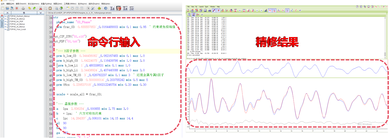 当我们完成对参数的精修步骤后,我们可以在绘图窗口直观的看到精修图谱的拟合程度与差值曲线。同时结合尽可能低的Rw值,并确保所有精修的参数与结构模型具备合理的物理意义。