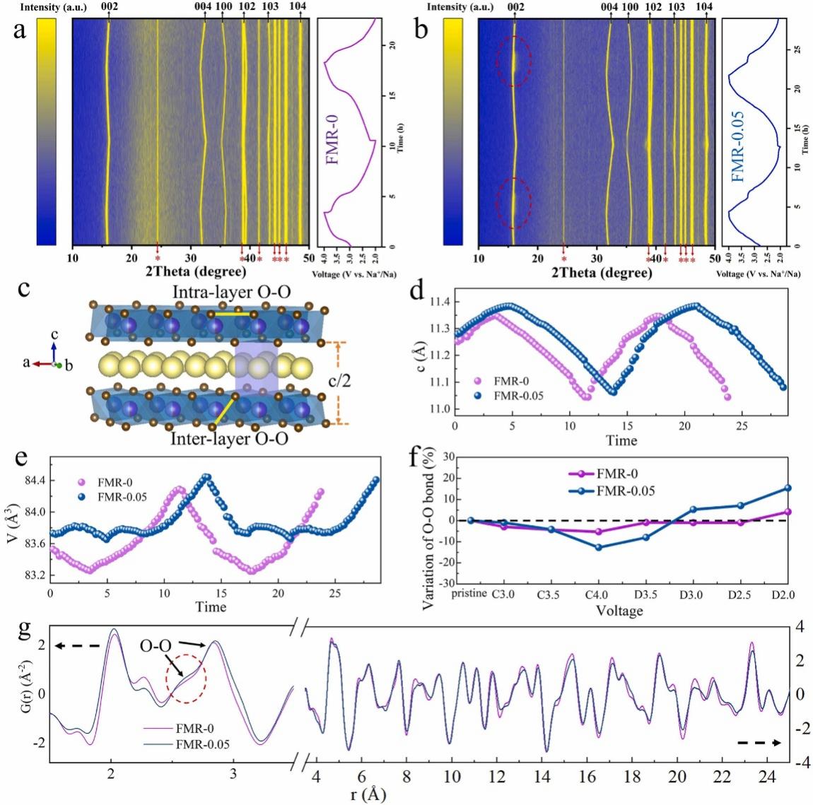 图 15 (a,b) FMR-0和FMR-0.05在10–50°的2θ范围内的原位XRD图谱;(c) FMR-x的相应晶体结构;(d,e) 放电/充电过程中FMR-0和FMR-0.05晶格参数的变化;(f) 在不同电压状态下层间O-O键长的相应变化;(g) 在充电状态 (4.0 V) 下收集的FMR-0和FMR-0.05的中子PDF图谱。