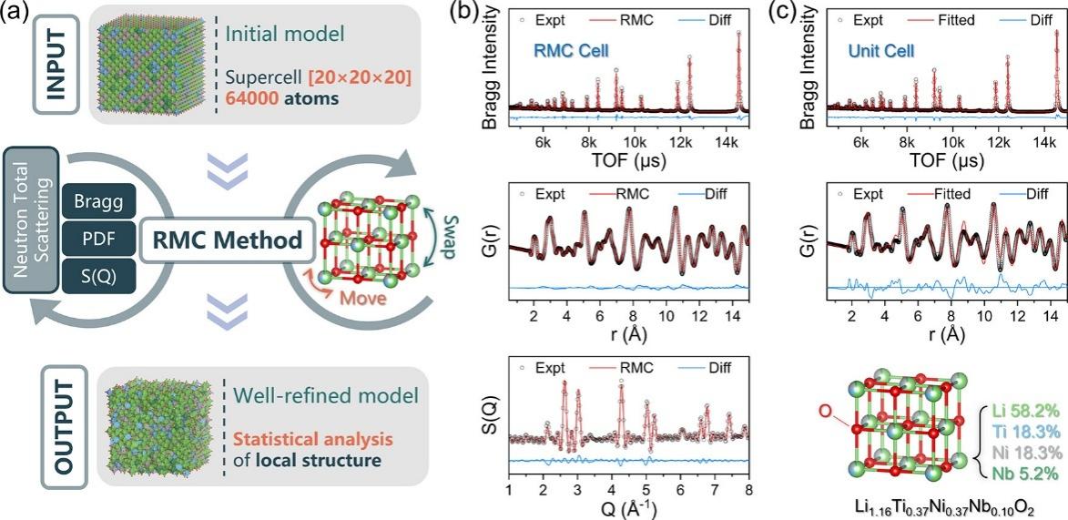 图 16 (a) RMC建模和拟合工作流程示意图;(b) Bragg、G(r) 和 S(Q) 数据的RMC拟合结果;(c)布拉格和 G(r) 数据的晶胞拟合结果;单位晶胞显示在插图中,并注释了位点占有和化学计量比。