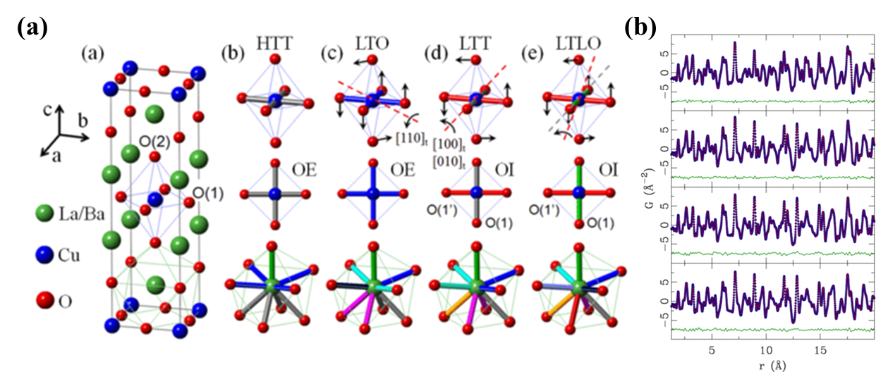 图 17 La2-xBaxCuO4在高温四方相I4/mmm (HTT)、低温正交相Bmab (LTO)、低温四方 相P42/ncm (LTT) 和低温过渡正交相Pccn (LTLO)中的结构细节;及 (b)对应的PDF数据拟合结构