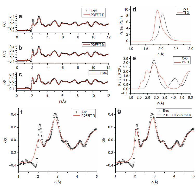 图 18 (a-c) 分别使用菱方相、单斜相结构和逆蒙特卡洛方法对PDF拟合的结果;(d) Zr-O和Ti-O原子对的短程区域PDF峰;(e) 来自RMC模型的Pb-O和O-O原子对的短程区域PDF峰;(f) 图a的放大视图,显示了原始数据和拟合结果之间的差异;(g) 添加围绕[111]轴的无序 Pb位移后拟合结果放大视图。