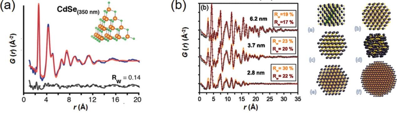 图 19 (a) CdSe量子点的PDF拟合图像。插图为拟合采用的闪锌矿金字塔结构模型;(b) 基于完全化学计量 (橙色线) 和非化学计量模型 (红色线) 的PbSe量子点的PDF拟合图像,并给出了具有不同表面构型的结构模型。