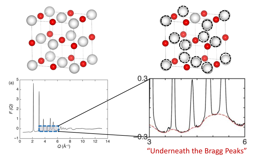 如前所述,任何原子排列都会使出射束产生干涉效应,形成对应的散射图像,但相对无规则的原子排列所产生的干涉效应,我们可以称之为漫散射,因其相对于布拉格衍射信号较微弱,往往隐藏于背底信号之中,如图2所示。如果我们能较好的收集并提取分析这部分漫散射信息,便同样可以获得关于局域结构中原子排列的信息。