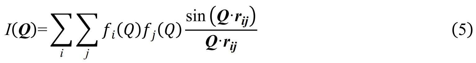 在实际的散射实验中往往采集的数据是与散射振幅的平方成正比的散射强度,我们同样可以用数学公式进行描述。通过将原子视为各向同性,散射振幅视为仅与Q相关的函数进行简化,可以得到散射方程:
