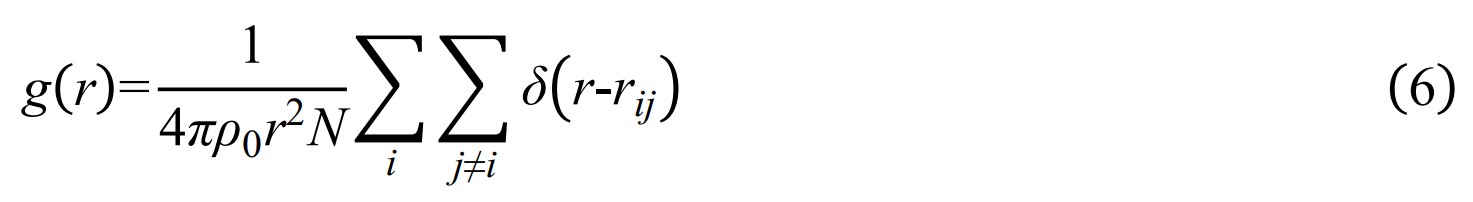 其中ρ0代表原子平均数量密度,N为原子总数,rij表示原子i和原子j之间的距离。δ (r−rij) 为Dirac-delta函数。直观上它反映了在一定距离r上找到相应原子对的概率[2,9]。